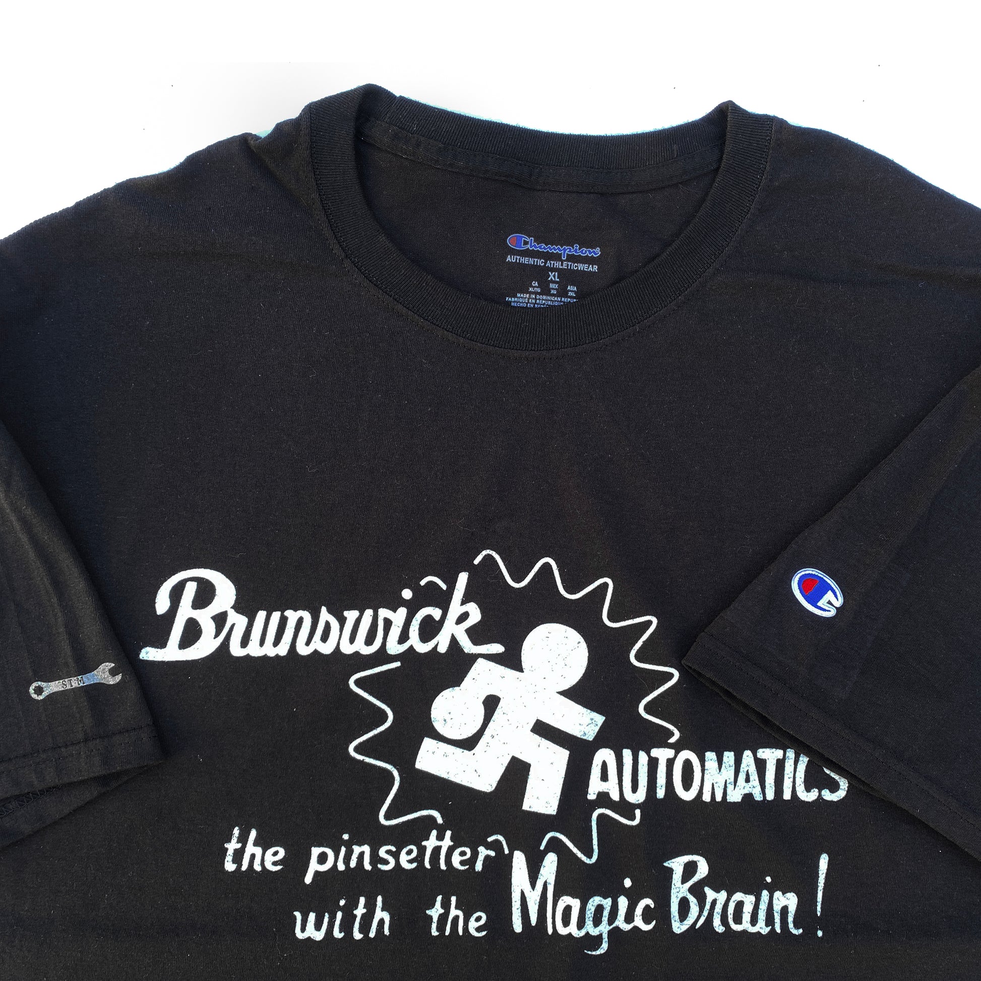When Brunswick first developed it’s automatic pinsetter, they touted it as having a “magic brain”. It somehow knew if pins were left after the first ball, or if you threw a strike. Revolutionary stuff. This shirt is an exact reproduction of Brunswick’s advertising from back in the day.